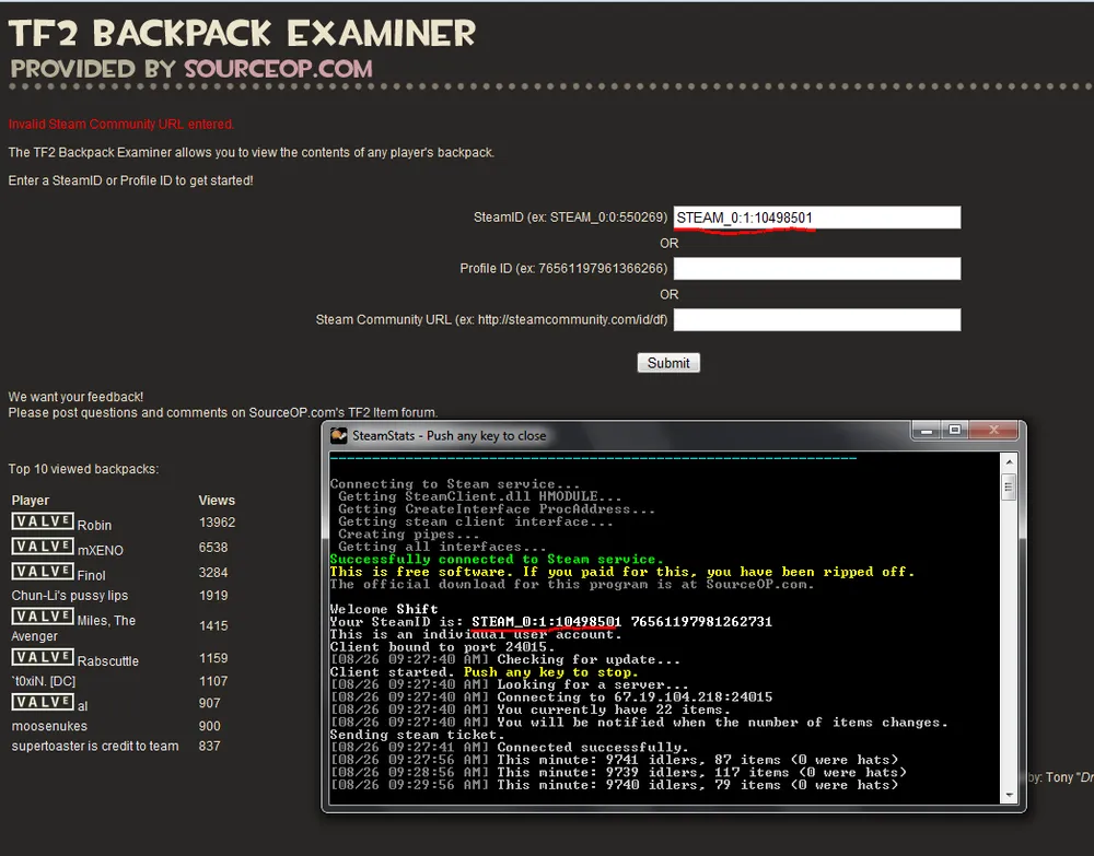 В сети появился сайт предоставляющий возможность посмотреть на любой рюкзак любого человека играющего в ТФ2