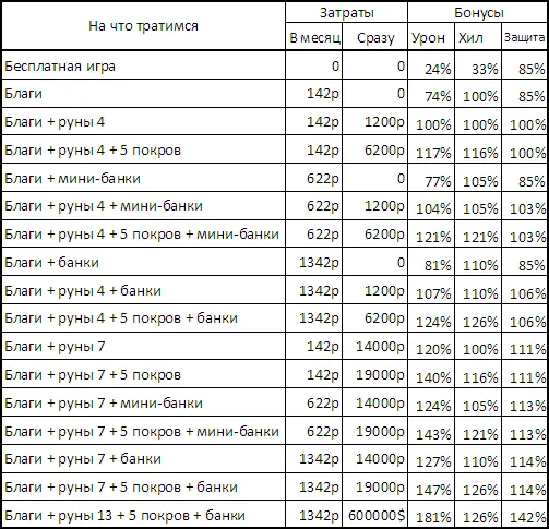Итак, сравнительная таблица для 42 уровня с расчётом на 4 часа активной игры в сутки: