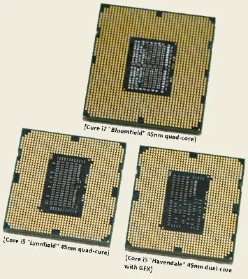 Чипы Core i7 Bloomfield разработаны под сокет LGA 1366 и построены на микроархитектуре Nehalem. На кристалле площадью 263 мм2 у них размещаются четыре 45 нм ядра и контроллер трехканальной памяти DDR3. В то же время будущие процессоры Lynnfield под сокет LGA 1156 имеют в основе ту же архитектуру Nehalem и четыре 45 нм ядра, однако поддерживают всего два канала памяти DDR3, а также включают в себя интегрированный контроллер шины PCI-Express, известный как DMI. Схема расположения контактов на чипах Lynnfield такая же, как и на Bloomfield. Отсюда можно сделать вывод, что специалисты Intel могли разработать более компактную ”упаковку” для Lynnfield, включающую интегрированные контроллеры двухканальной памяти и шины PCI-Express.