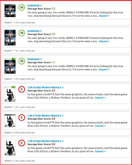 Система пользовательских оценок, однако, не лишена недостатков. На момент написания этой статьи пользовательский рейтинг Modern Warfare 3 составлял (при максимуме в 10 баллов) 3.2 балла в версии для Xbox 360, 2.8 на PS3 и 2.0 на PC. Средние оценки критиков (по 100-балльной шкале) составляют 89, 88 и 81 соответственно.