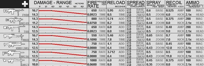 ПКМ обладает наибольшим уроном вблизи, повреждения ПКМ на дистанции 60 метров - больше, чем у любого другого пулемета (исключая М60, который был имбой только до последних патчей, где его сильно порезали, уравняв с ПКМ). Также данный пулемет обладет самой долгой перезарядкой - 8.5 секунд, выше, чем у всех пулеметов.