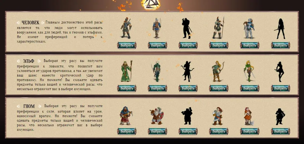 На стадии выбора расы вам предложат выбрать за кого вы хотите начать: человек, гном или эльф. Преимущество человека - он может носить любую экипировку в игре. Гномы имеют бонус к силе +15% и жизни +10%, эльфы к ловкости +20%. Гном носит только свою и человеческую экипировку, эльф - эльфячью и человеческую.