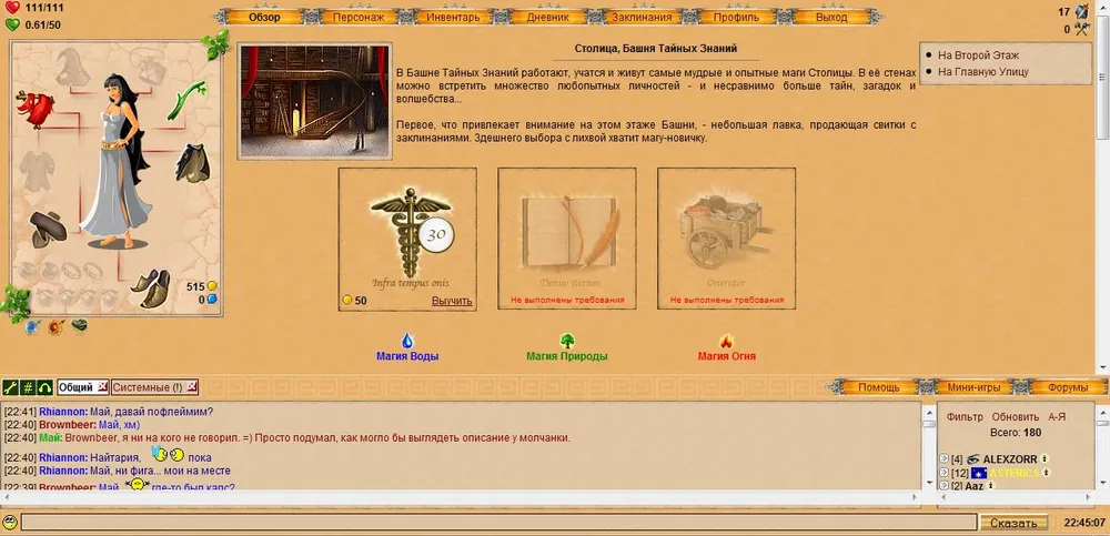 Единственное учебное заведение Столицы - это Башня Тайных Знаний. На первом этаже башни можно изучать заклинания всех трёх стихий, на третьем - заряжать посохи, а на четвертом - улучшать посохи.