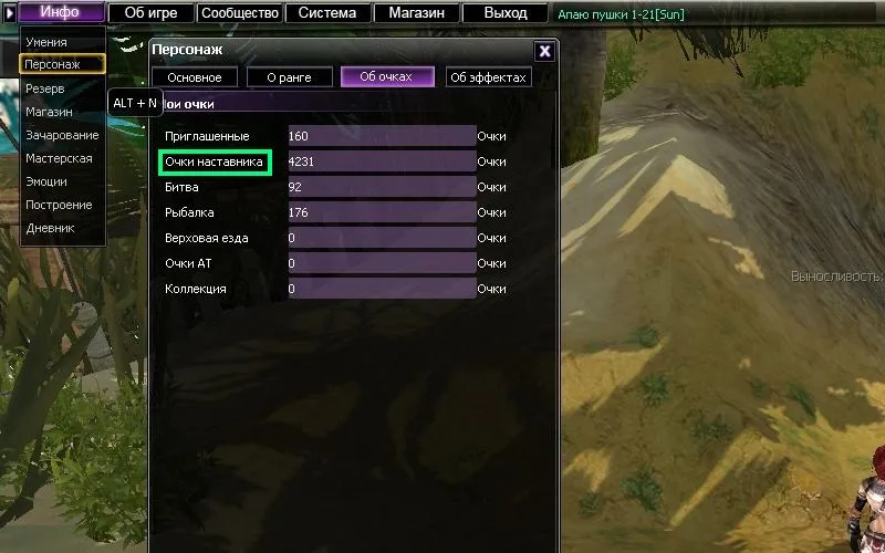 [B]Сколько у вас «очков наставника» можно посмотреть в разделе [Инфо] » [Персонаж] » [Об очках].[/B]