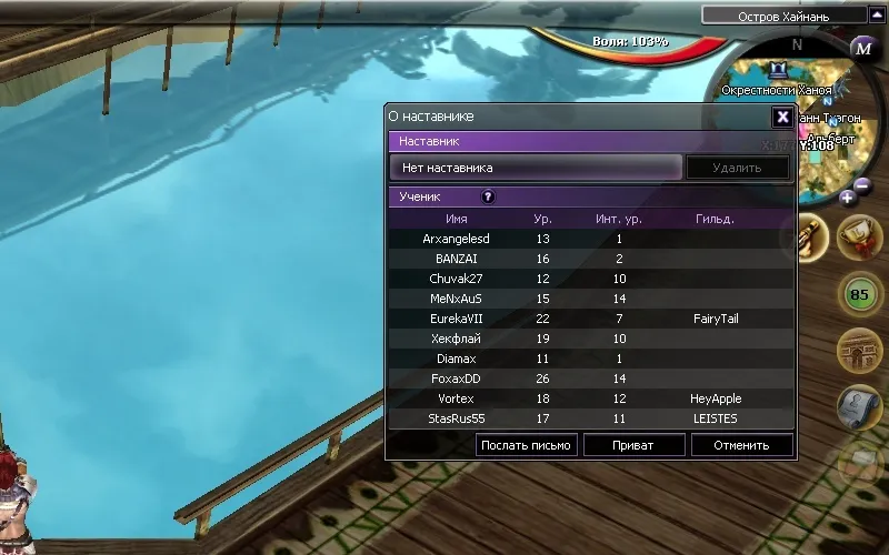 Будучи наставником, в этом же окне будет отображаться список нынешних учеников: никнейм, текущий уровень, уровень на котором он стал вашим учеником и наличие гильдии.