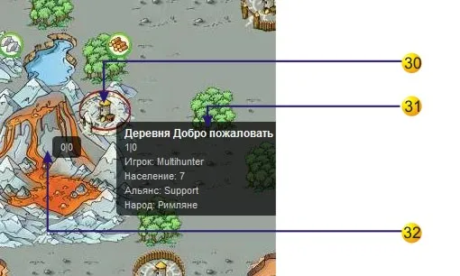 В центре карты, как и в старые времена, живет Мультихантер (см. 30). МХ всемогущий, модератор, следящий за надлежащим исполнением правил. Если навести курсор на деревню, то всплывет информация (см. 31).