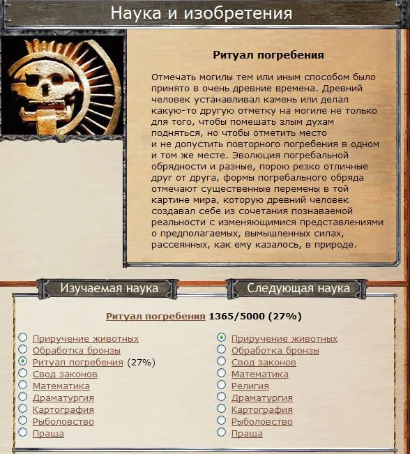 Здесь стоит отдельно упомянуть о ключевой особенности этой игры - науках. Система напоминает ту, что была в Цивилизации Сида Мейера. Существует некое "древо", где чтобы изучить новую науку, сначала требуется подобраться к ней, изучая другие. Уникальность в том, что это "древо" невозможно "распутать", то есть, например, дойти до комьютеризации, не изучив обработку бронзы. Все науки (а их более полутора сотен) очень тонко связаны друг с другом. Этот переплетенный "клубок" и формирует понятие баланса и степени развития в игре.