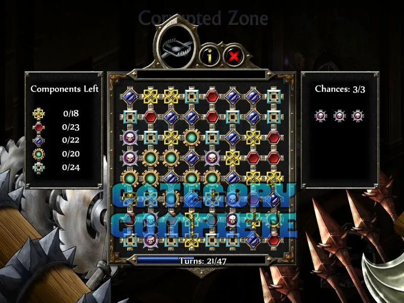 Собственно вот паззл ловушки. Собираем нужные цвета и побеждаем. Черепки справа— попытки, если вы соберете черепки на доске, то попытки уменьшатся. По одной за три собранных черепа. Если попытки закончатся, ловушка сработает.
