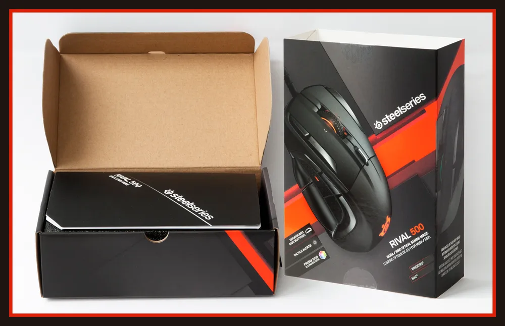 Rival 500 поставляется в коробке из тонкого, но прочного гофрокартона, дополнительно упакованной в картонный же рукав, оформленный в традиционном для продуктов SteelSeries стиле: серо-оранжево-белая цветовая гамма, изображения девайса на передней и боковых поверхностях и краткая техническая информация на задней поверхности. Там же наглядно показано, где и какие кнопки у этой мыши есть.
