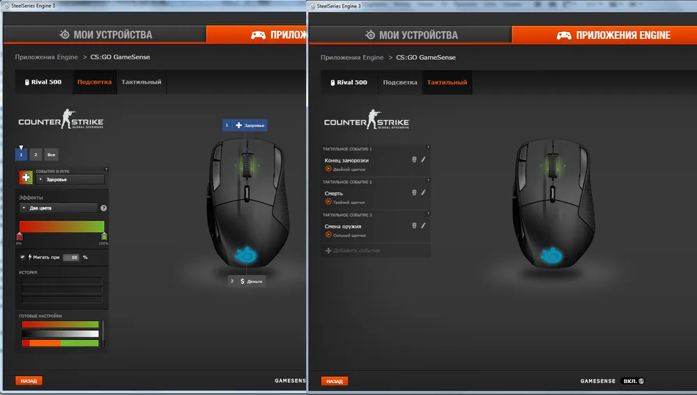Кроме всего перечисленного, Rival 500 также поддерживает особые режимы подсветки и тактильного оповещения для некоторых игр. По умолчанию таковых на сегодняшний день шесть – Counter-Strike: Global Offensive, DOTA 2, Minecraft, «Gigantic», «iFeelPixel», «Utopia 9». Настройка этих режимов производится не в окне настроек конкретного устройства, а во вкладке Приложения Engine главного окна программы. Суть подобной фишки сводится к тому, что в указанных играх подсветка мыши служит индикатором состояния одного или двух (по количеству зон подсветки) наиболее для вас важных параметров (здоровья, запаса маны, количества убийств, прочности инструмента или чего-то еще), а вибрация – индикатором какого-либо события (смерти, смены оружия, совершения определенного количества убийств, окончания заморозки и т.п.). Перечни доступных для каждой игры параметров и событий, естественно, различаются.