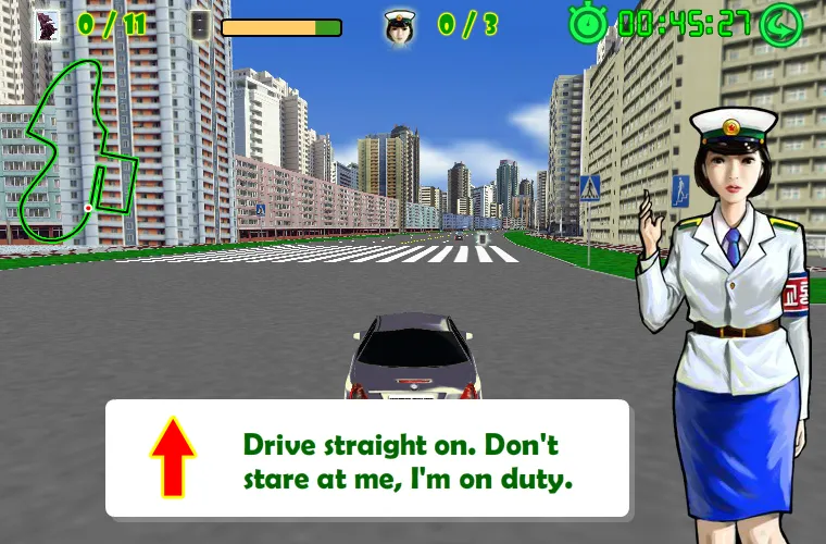 Кататься по Пхеньяну несложно; главное — вовремя подбирать топливо (бочки с нефтью, щедро расставленные на магистралях столицы мира). Валютным туристам прощаются безобразия: наезд на двух (но не больше!) местных участников движения и езда по встречке. Еще можно наезжать на карточки с описаниями достопримечательностей Пхеньяна («Триумфальная арка — но без парижских пробок»). А в целом город напоминает Москву времен Леонида Ильича. И музыка, как в «Ну, погоди!». Часто влезают в кадр регулировщицы; они, нужно сказать, обнаруживают сходство с женскими персонажами MMO от NCsoft. Восточно-азиатский большеглазый кавай непобедим даже для чучхе.