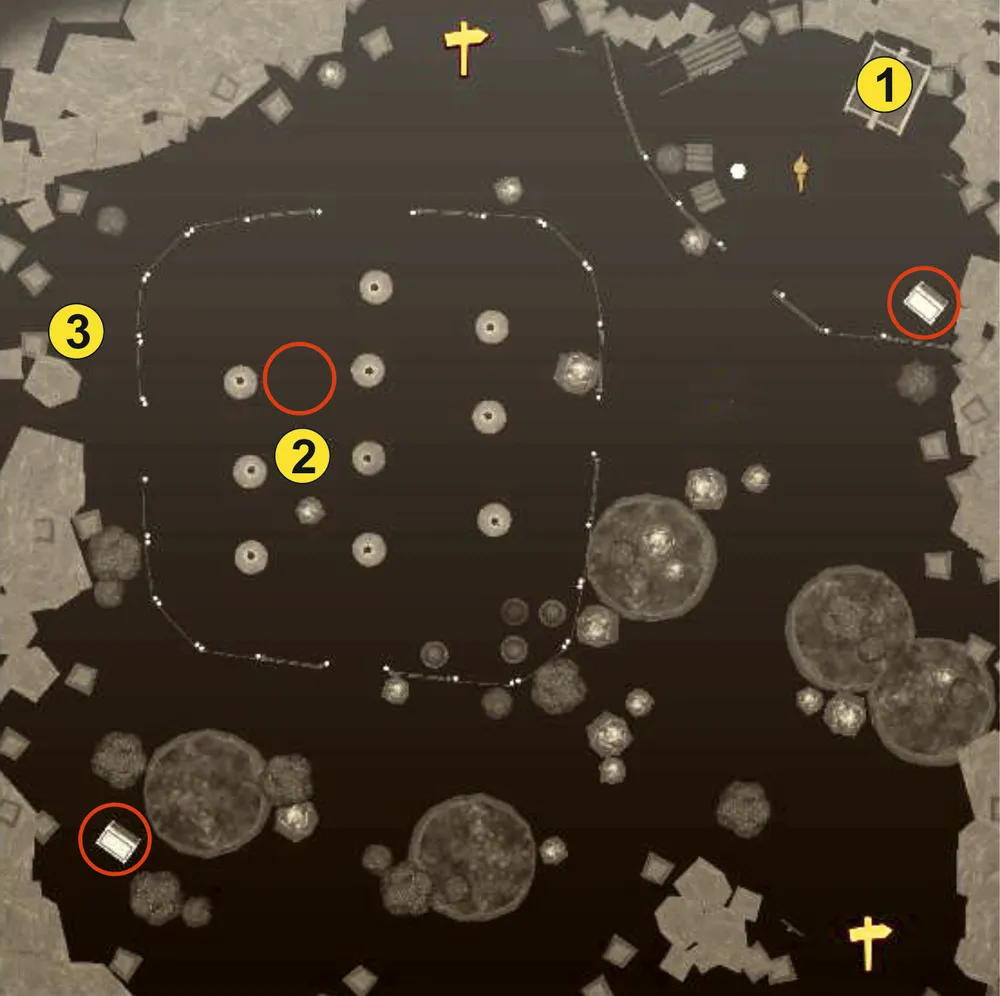 1 – бочка с TNT. 2 – завал. 3 – лагерь Дубины.