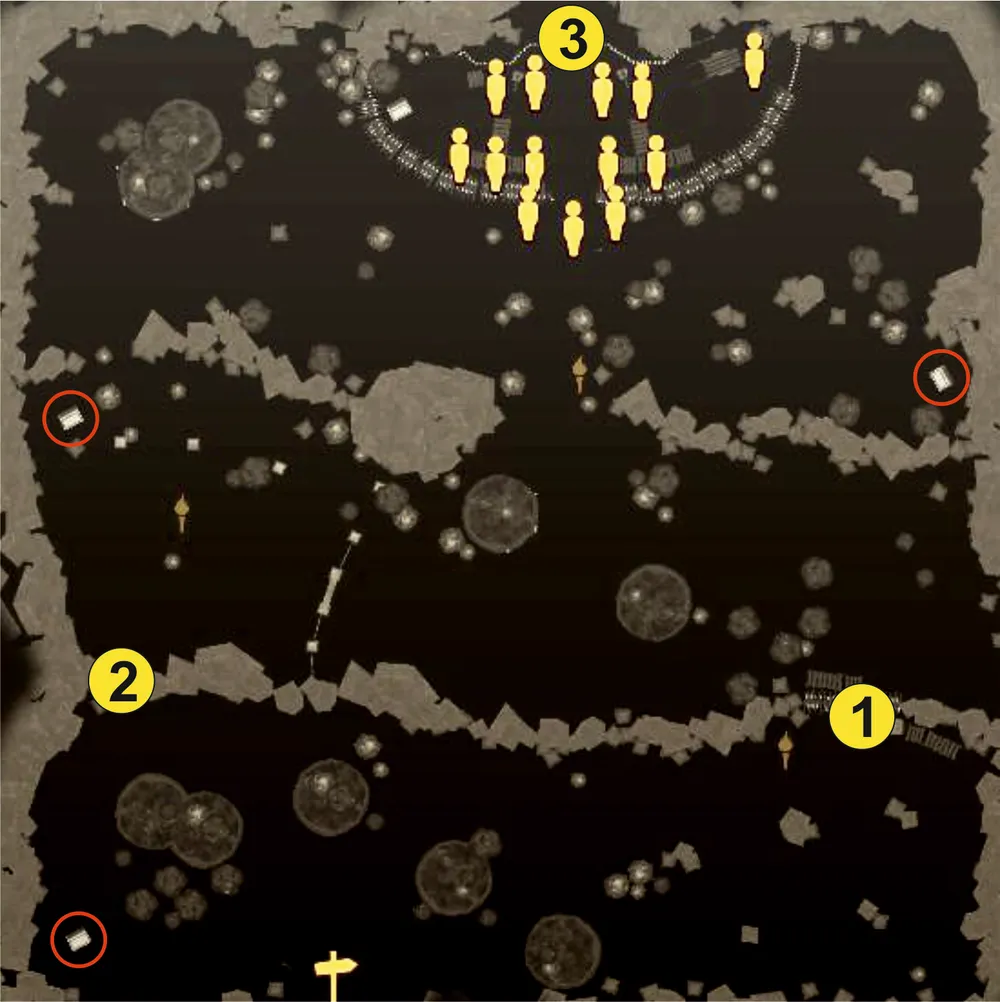 1 – жрец. 2 – рычаг. 3 – решетка. 4 – колодец. 5 – место спуска. 6 – рычаг. 7 – хранилище TNT. 8 – морозный туман. 9 – завал. 10 – гигантский носатик. 11 – рычаг. 12 – ворота. 13 – выход из жуткого колодца. 14 – вход в жуткий колодец. 15 – рычаг. 16 – ворота. 17 – реликвия. 18 – рычаг. 19 – ворота. a,b – магические кубы.