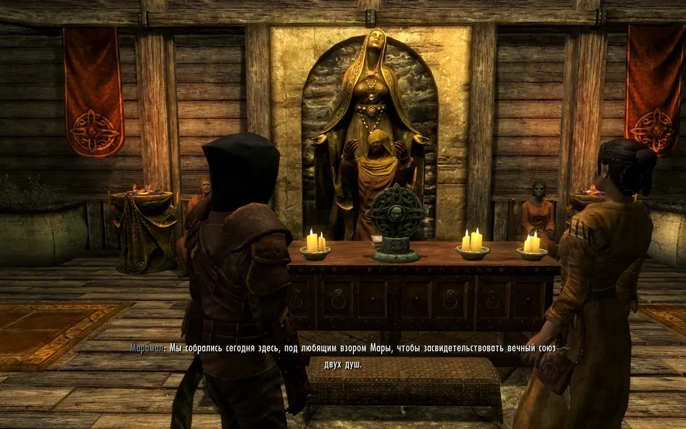 Больше мы с братом его не видели. На протяжении двух месяцев торговля шла хорошо, когтя больше не было в витрине. Лукан всегда носил его с собой, и лишь при приходе важных с виду покупателей, предлагал сию вещь. Как-то однажди, дверь в магазин распахнулась и в нее вошел каджит. Он был очень хорошо одет. Так сразу и не скажешь, что это была броня. Черная, с длинным плещем. Я сразу узнала этого кота. Я запомнила его лицо, наверное, на всю жизнь. Теперь он уже не казался мне таким ужасным. Довольно-таки привлекательная особь. Он поздоровался, подошол к Лукану и спросил у того, как обстоят дела. Мой брат был очень рад видеть его. На счастье, дела на то время обстояли неплохо, жаловатся было не на что. После короткого разговора, Лукану было очень интересно узнать имя своего, так сказать, спасителя. Каджит, немного поразмышляя, ответил - Тимофий. Но пришел он в наш магазин совсем не за болтовней. Он внезапно подошел ко мне и завел разговор. Пару секунд спустя я заметила у него на шее сверкающий амулет Мары. Свой же я никогда не снимала, он все время был у меня на шее. Неужели...? Тимофий продолжал разговор, медленно подходя к основной теме... И вот каджит предложил мне стать его супругой. Моему удивление не было предела. С виду он был очень багат, мог постоять за себя... Почему бы и нет? Я тут же дала свой окончательный ответ - да! Ведь жизнь в Скайриме опасна и кто знает, когда ей наступит конец. Глаза Тимофия засияли. Лукан тоже был рад, поэтому, не задумываясь, отпустил меня. Свадьба состоялась уже на следующий день, в Рифтене. Мы закрепили наши отношения священными узами брака.