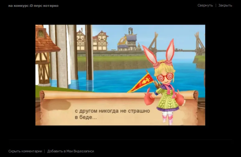 Работы победителей приятно удивили, и я решила скопировать ссылки на них в этот блог. Почему ссылки? Потому что по условиям конкурса работы выкладывались в официальной группе игры на ресурсе "Вконтакте". Только один из 5 победителей сделал зеркало видео на Youtube, остальные будут представлены скриншотом и ссылкой.