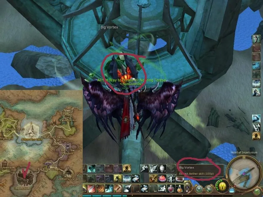 Прокачав сбор до 50, можно перебираться в импетус, где с земли легко собирать кристалы 50, а с центральной постройки позже 75, меняя каналы. Далее забираемся на верхнюю площадку импетуса и с неё на уступ, чтоб над головой был кристал 100. Минимально стоит прокачать тут скил до 125, но место очень удачное, дальше будет сложный этап.