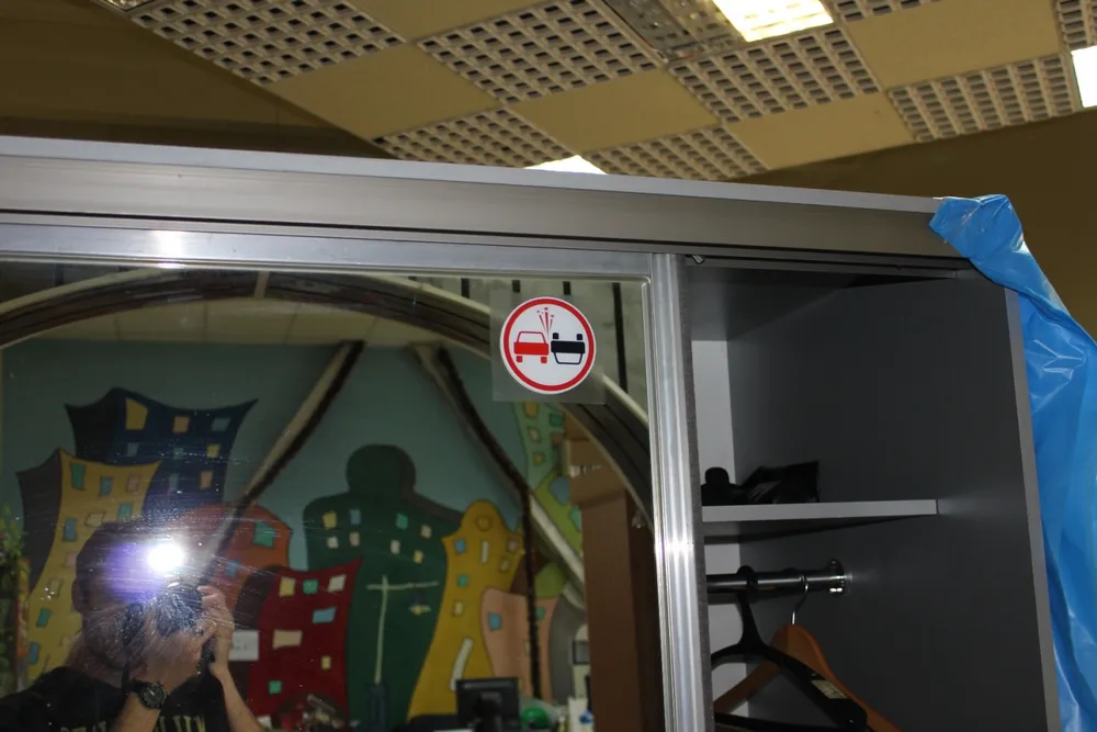 Наклеечку можно разрезать и применить на холодильнике\окне. Я выбрал наш офисный шкаф с заляпанным зеркалом.
