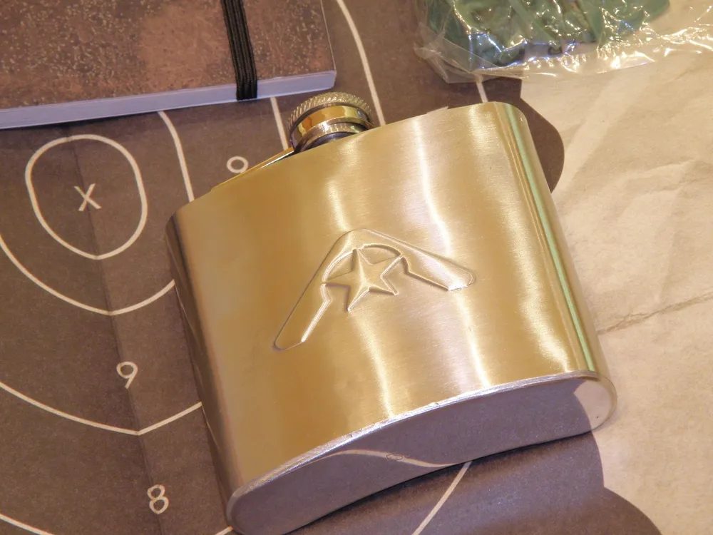 Фляга мне понравилась очень. Ёмкость - 6 oz (~ 170 ml), гравировка с обеих сторон качественная и приятная на ощупь. Крышка закрывается плотно и драгоценный напиток не проливается.