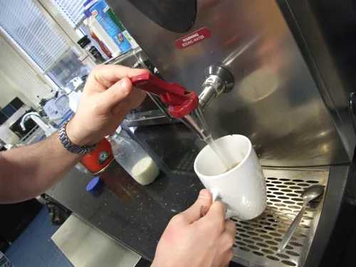 А тут Пит показывает, как идеально наполнять кружку. Любители точности также отметят шоколадный напиток «Aero» сбоку. Прекрасный выбор.