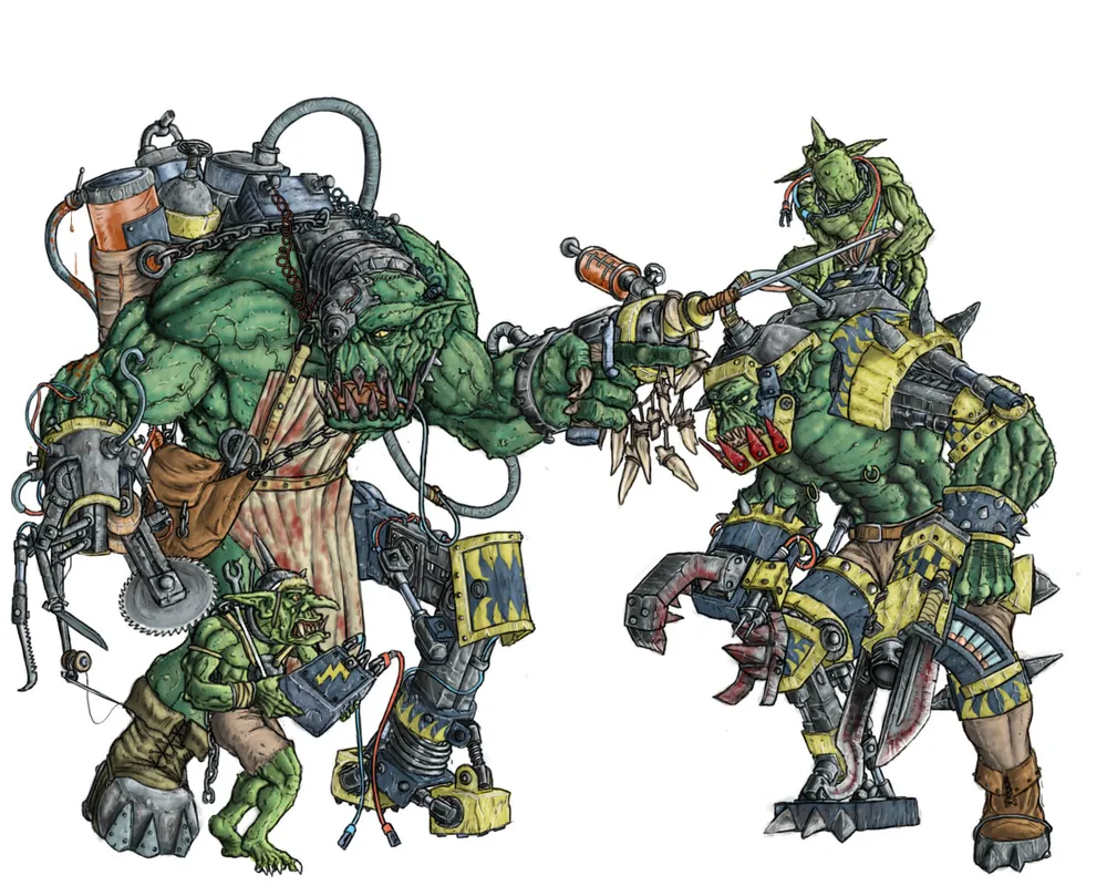 место или подходящее тело(серьёзно!)Да и шрамы эффектно подчеркнуть у туповатых парней не выйдет. К счастью у зеленокожих есть Доки, так же известные как Боляки (Painboyz) По истошным воплям пациента(наркоз для хлюпиков) док узнаёт, когда резать дальше, а когда уже поздно спасать "потерянного". Зубы за операцию изымаются из пасти пациента как правило во время оздоровительных процедур.