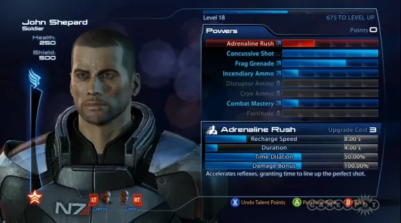Меню напарников выглядят именно так. Измененная расцветка панелей поначалу сбивает с толку своей непривычностью, а так левая часть экрана почти ничем не отличается от «Mass Effect 2». В самом верху мы имеем, как и раньше, имя персонажа, затем количество жизней и так далее. Внизу – привычное листание между персонажами. Но нас поставила в ступор шкала «Героя»/«Отступника». В первых двух частях эта шкала принадлежала исключительно капитану и предоставляла нам специальные варианты ответов для окраса многих ситуаций. В «Mass Effect 2» она даже влияла на внешний облик Шепарда. И вот, теперь она доступна и напарникам! Очень интересно, как она будет влиять на их поведение. Однако странно, что имея 18 уровень, Лиара до сих пор не пополнила эту шкалу… Все нововведения в большинстве своем перепали правой части экрана, ведь именно там находятся умения персонажей. Как и обещали «BioWare», отныне умения не будут состоять из одной четырехуровневой полоски, имеющей к концу всего две альтернативы. Теперь у каждого умения есть свои собственные характеристики. Красным цветом выделено умение Лиары “Сингулярность”, а внизу показаны его возможные улучшения: Скорость Восстановления, Продолжительность и Радиус Поражения. В «Mass Effect 2» все эти показатели были объединены в один. Помимо “Сингулярности” Лиара обладает “Заморозкой”, “Броском” и “Подъемом”. Для улучшения уровня умений по-прежнему требуются специальные очки.