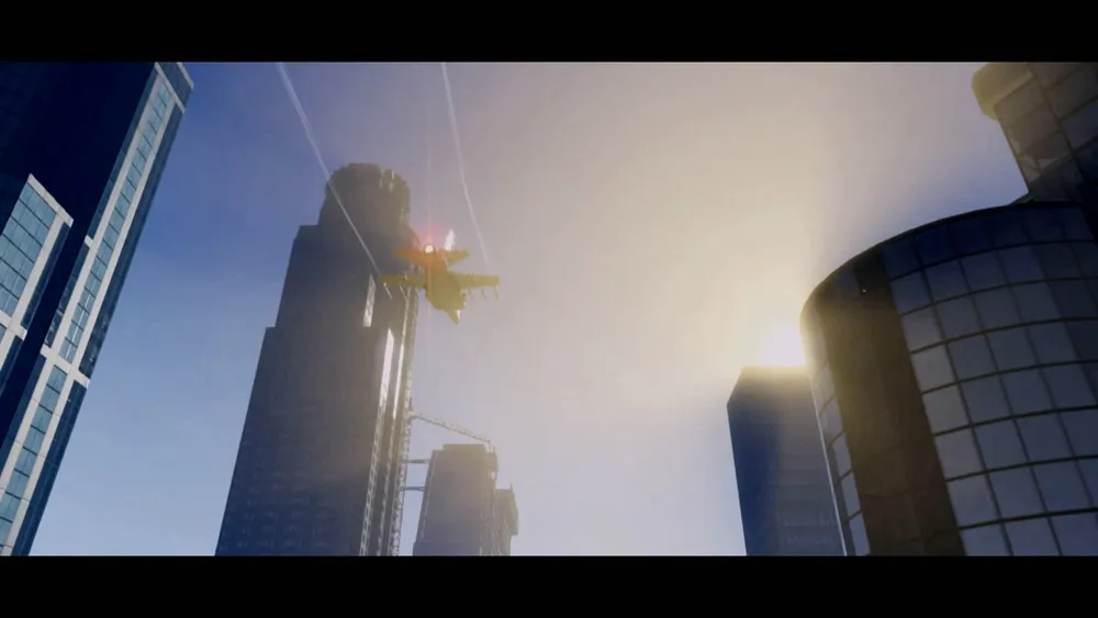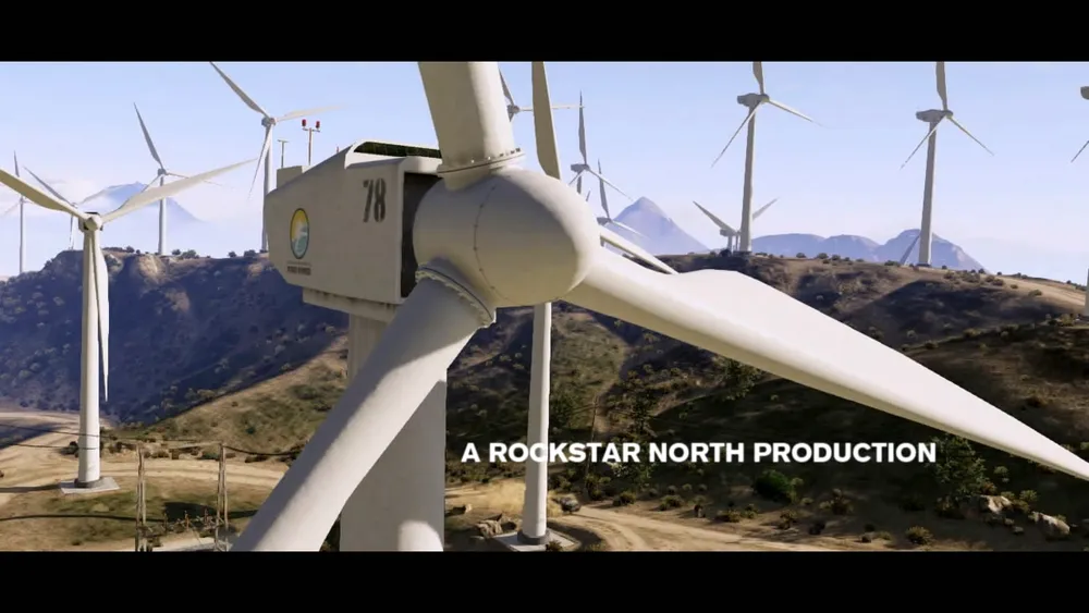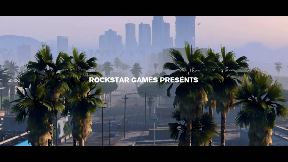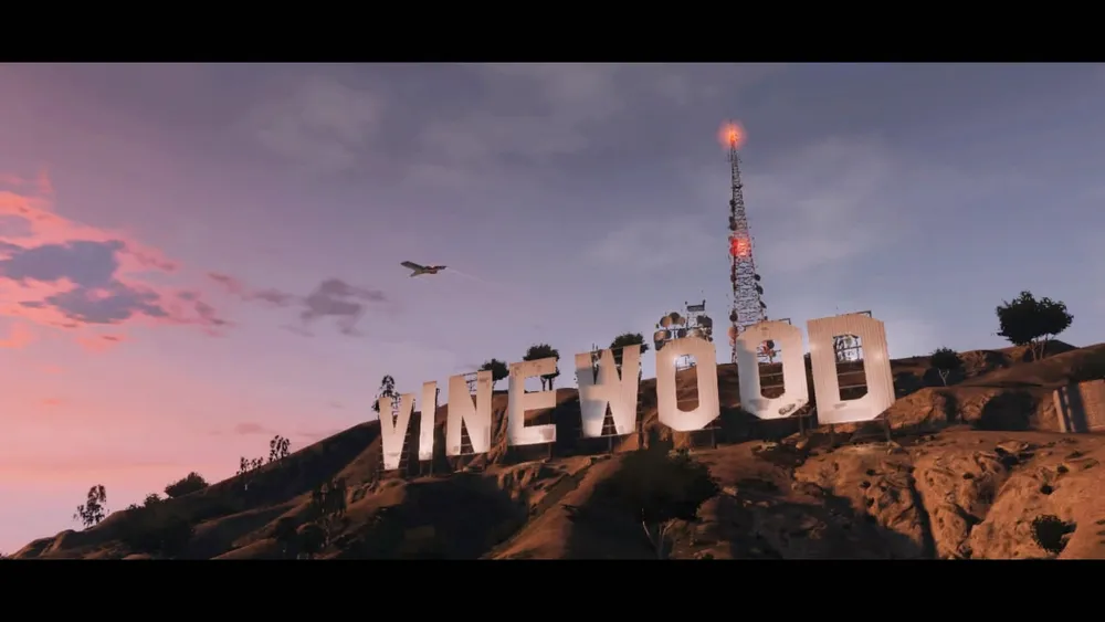 Для безнадежно тупых тех, кто невнимательно смотрел трейлер, сделали совсем уж прозрачный намек на место действия. Vinewood, Голливуд Сан-Андреаса. В небе аэроплан.
