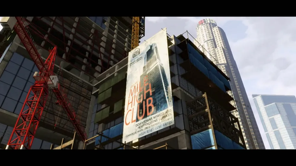 Стройка Mile High Club, "новейшего и самого ожидаемого комплекса в центре города". Все дружно вспоминаем стройку из Vice City, маленький радиоуправляемый вертолет и гору разбитых мышей и клавиатур. На фоне, кстати, здание какого-то банка. Красные буквы, увы, нечитаемы.