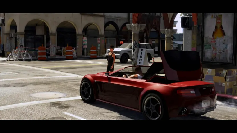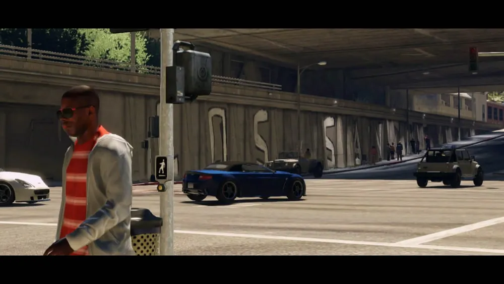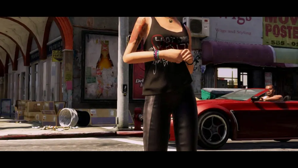 По пешеходному переходу вышагивает вызывающего вида девица, явно только вышедшая из пирсинг-салона на углу. За рулем красного авто сидит некий темнокожий парень в белой майке. CJ? Вряд ли. Но наверняка кто-то с ним связанный. Вряд ли рокстар стали бы упускать возможность хоть как-нибудь вплести в историю СиДжея, учитывая, что действие происходит в Сан-Андреасе.