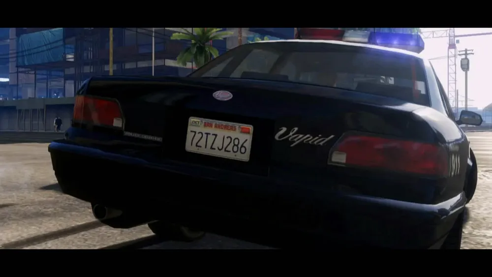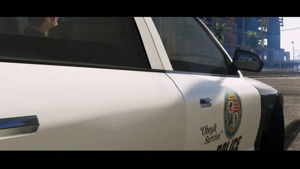 Погоня, за рулем авто (теперь с поднятой крышей) уже знакомый нам парень. Машина полиции с замечательным слоганом "Повинуйся & Выживай" и надписью San Andreas на номерах.