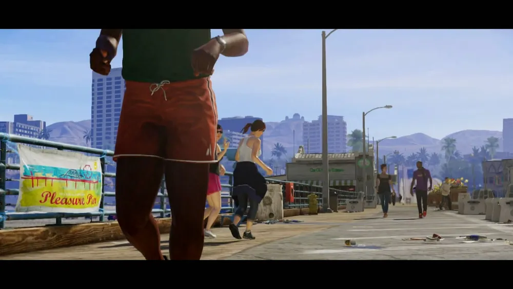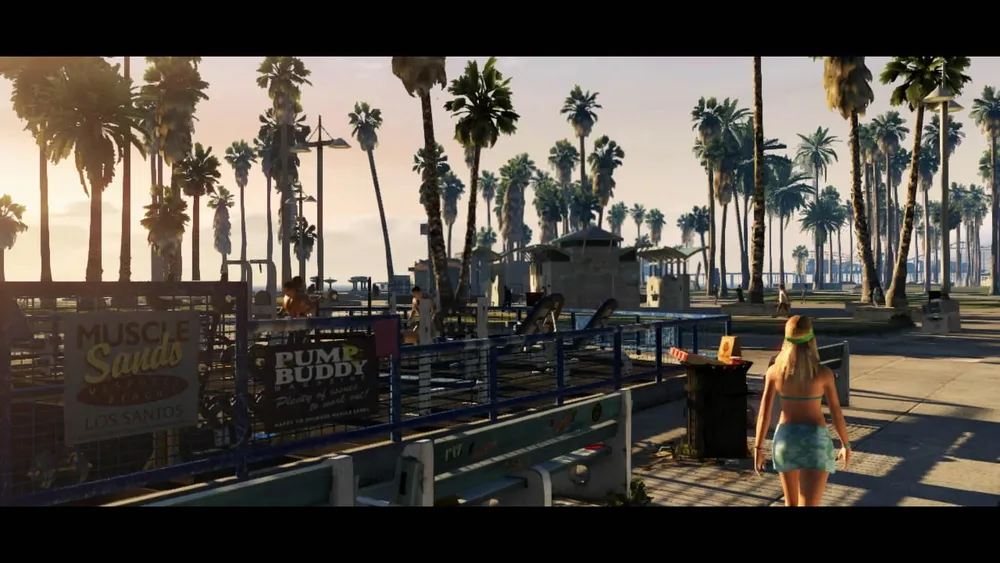 Vespucci Beach, спортивная площадка Muscle Sands (Sands - Hands, ок) с парой качков в нагрузку. Опять дадут возможность качаться/менять внешность? Далеко на заднем плане пирс с аттракционом. Скорее всего тот самый Pleasure Pier из первых кадров, так что это всё где-то в одном районе находится.