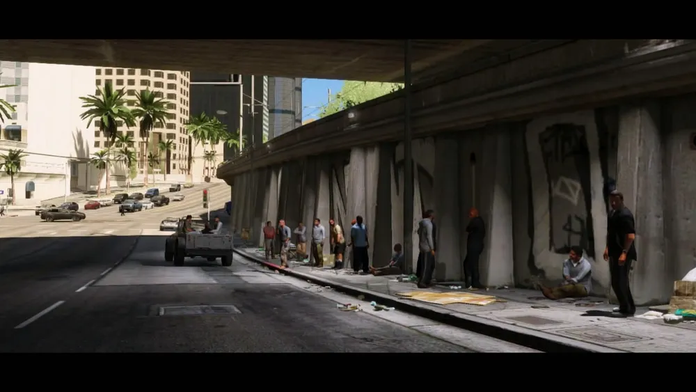 Бомжи под мостом со всей полагающейся атрибутикой. Судя по женщине справа, за физику персонажей вновь отвечает движок Euphoria.