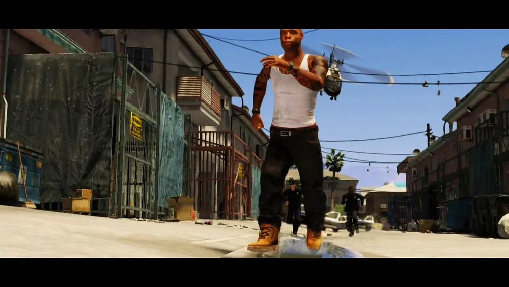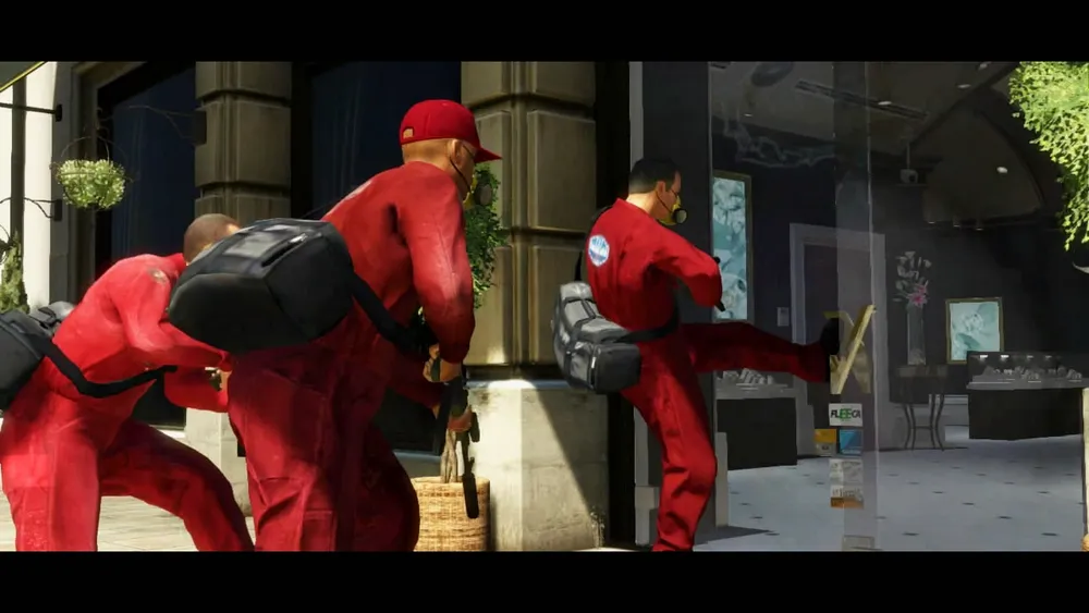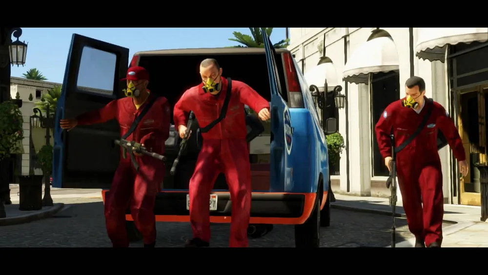 Мужчина, упомянутый выше, дважды стучит по фургону бригады по уничтожению насекомых (Bugstars), тем самым давая своим напарникам сигнал к началу операции. Напарники: темнокожий юноша (наверняка тот, из красного авто с откидным верхом) и некий бритый под 1мм опасного вида субъект. Троица, вооружившись карабинами с глушителями, врывается в ювелирный магазин. Предельно олдскульное ограбление. Туго с деньгами, надо полагать.