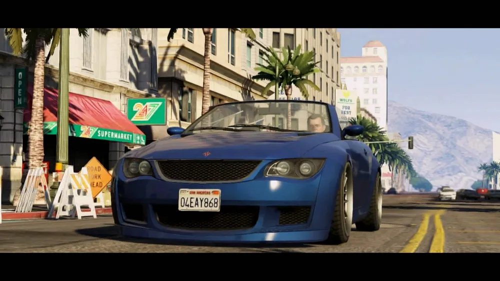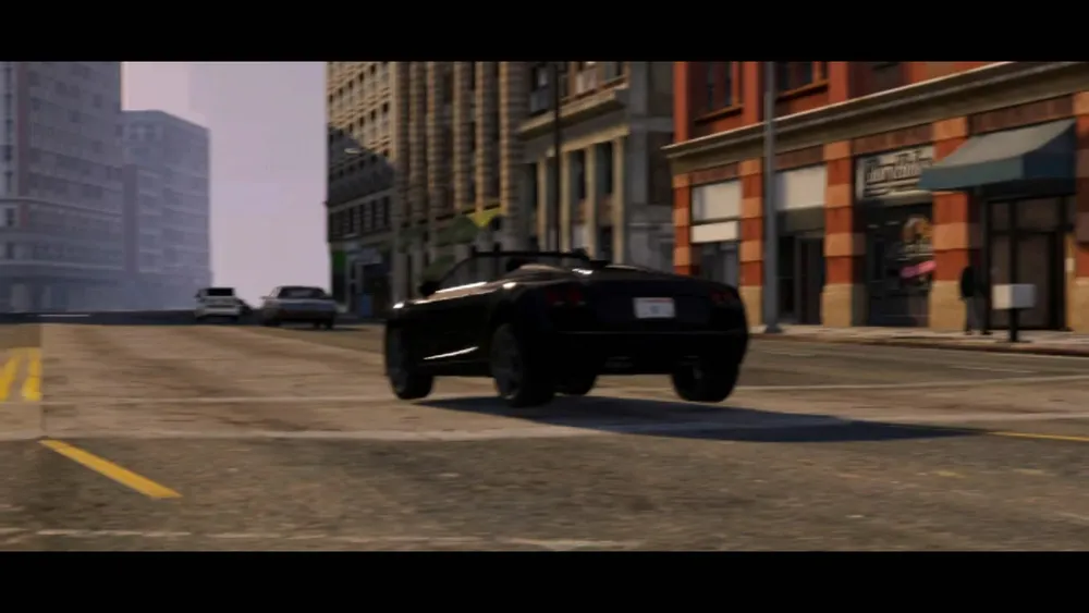 Синий кабриолет мчится мимо пиццерии Pizza This... (логотип содрали у Pizza Hut), магазина Daily Globe ("555-0111 новости со всего мира, открыто 24/7"), агентства Wolfs и супермаркета "24/7". За рулем всё тот же неугомонный дядька.