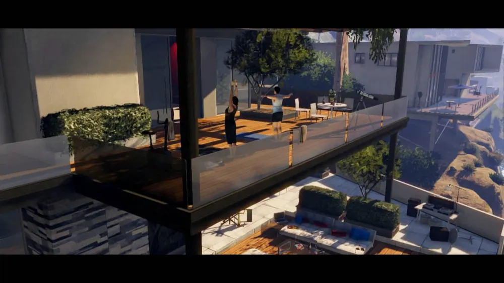Природа, особняк, поблизости водоем. Пара занимается йогой. Кат-сцена, скорее всего (больно деталей много), так что не исключено, что справа один из главных героев. Может быть эти же товарищи мелькали в первых кадрах на пляже.