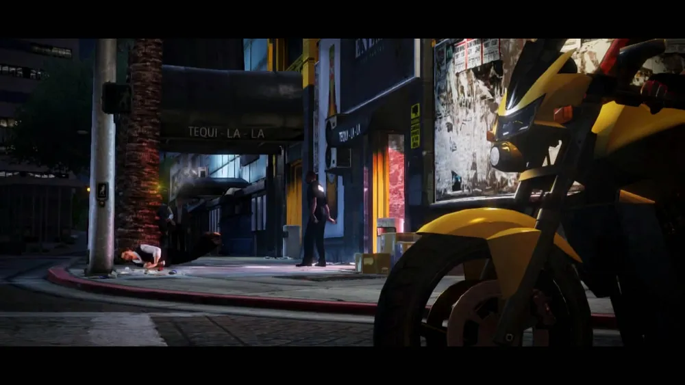 Охранник выкидывает посетителя из клуба Tequi-La-La, и снова Euphoria в действии. На переднем плане мотоцикл.