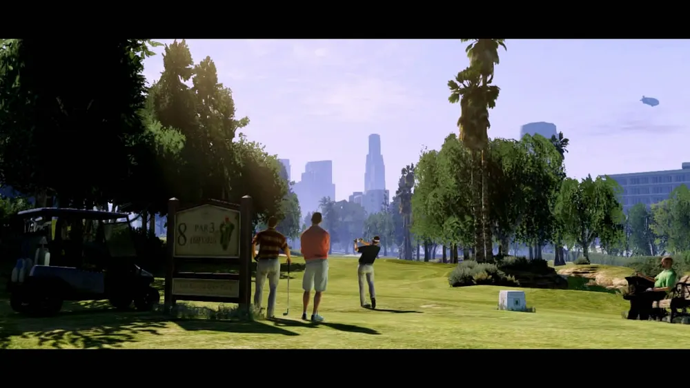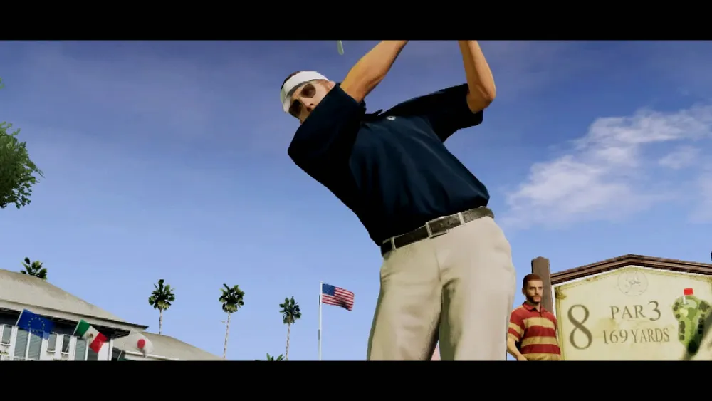 Машинка для гольфа (наверняка дадут погонять, иначе зачем), табличка с надписью "8, par 3, 169 yards" (что бы это ни значило) и первая встреча с Дирижаблем (справа сверху). Вообще не понятно, кат-сцена это или нет. Если нет, то здорово, конечно. Такая-то анимация, все дела.