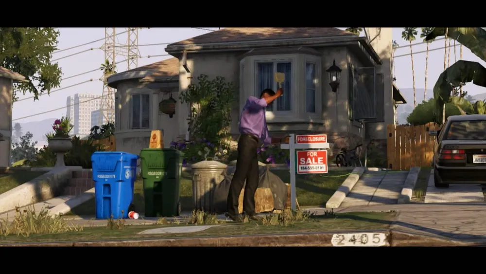 За отъезжающей почтовой машиной ("Наша задача - не потерять вашу почту") мы видим чернокожего мужчину в вызывающе сиреневого цвета рубашке, вколачивающего в землю вывеску с информацией о продаже дома. Сам дом очень похож на один из тех, что были на Грув Стрит в SA. Жизнь СиДжея и банды не задалась? Может быть. Возле забора стоит велосипед, на котором нам наверняка дадут покататься (седой Версетти на bmx'е, здрасте приехали). На бордюре цифры 2405. Удивительное дело - 24 мая день рождения автора данного поста свет увидел альбом Ogdens' Nut Gone Flake группы Small Faces, песня из которого играет в этом самом трейлере. Чудеса и магия. Еще есть мнение про 24.05.2012, но это уже не так интересно.