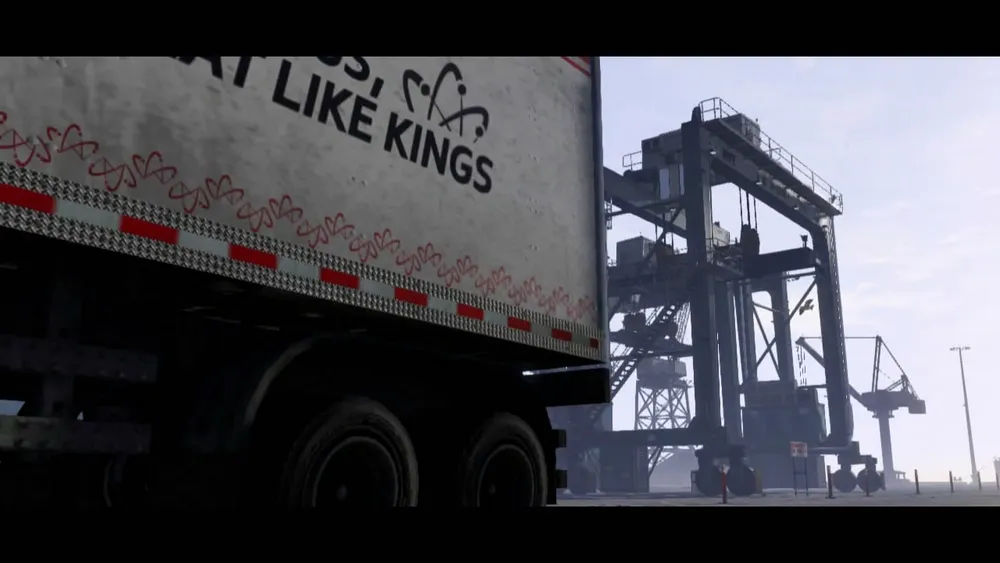 Грузовик Up-n-Atom Burgers ("Once it pings, eat like kings", черт его знает, как это переводится). У всех машин шины Atomic, кстати говоря (к вопросу о детализации). На фоне порт Лос-Сантоса.
