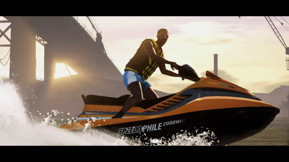 Товарищ в солнечных очках рассекает по портовым водам на аквабайке Speedophile 2000.