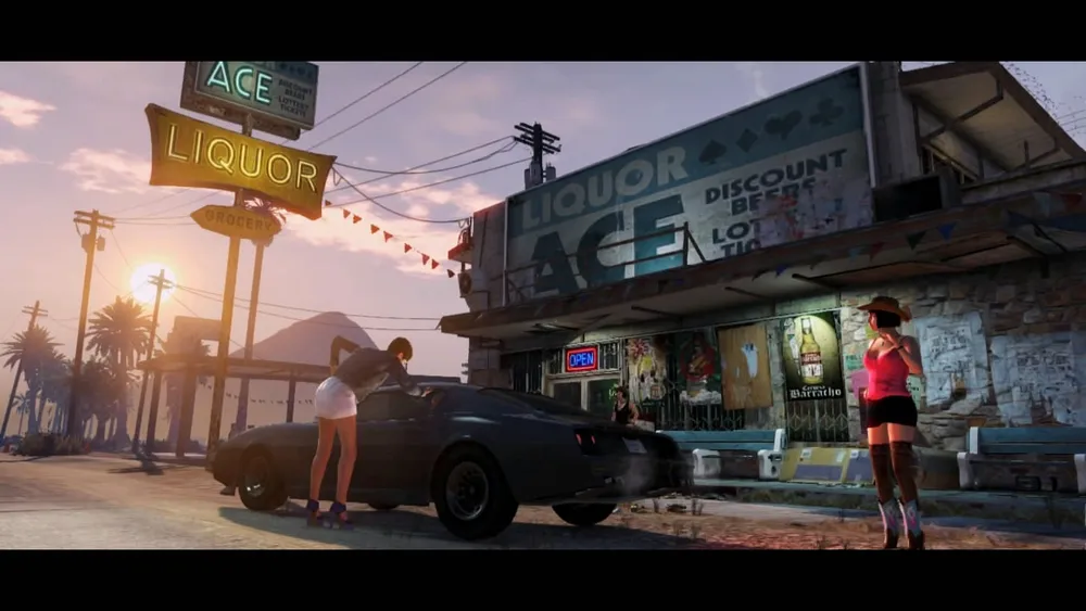 Пустынного вида местность (окрестности Лас-Вентураса?), потрепанный бар/магазин (вывеска хороша - "Выпивка, овощи"), дама легчайшего поведения (куда уж без), заправка на фоне. Если верить вывеске, в магазине также торгуют лотерейными билетами и, если правильно понимать ACE и карточные масти, играют в карты. Занятно.