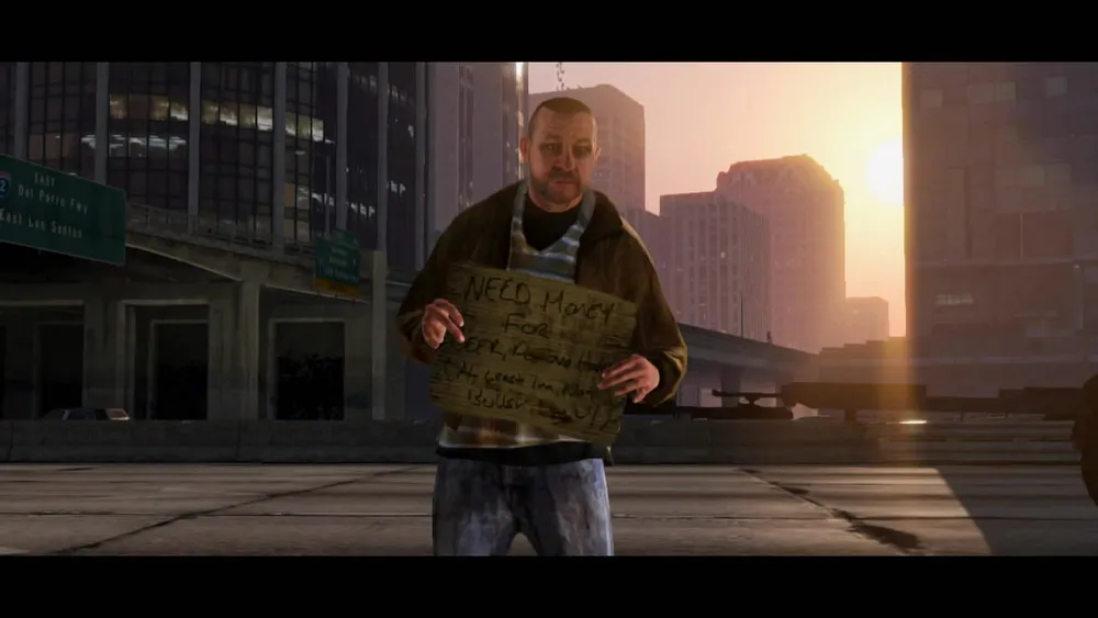 Нико профукал эмерикэн дрим и теперь топчется на автостраде, выпрашивая денег на пиво. По дороге проезжают грузовики, тот что сзади едет с пустым прицепом (открепляемые прицепы, как в GTA3?).