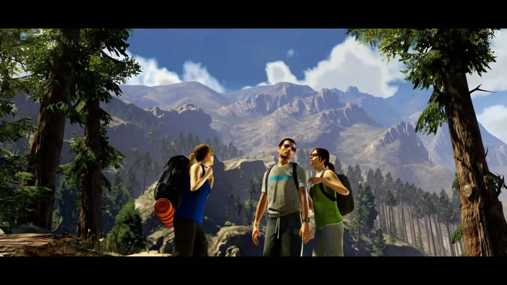 Семья в походе на фоне гор. Похоже на внутреигровую рекламу или передачу, как обычно высмеивающую СШАшное восторженно-семейно-патриотическое ТВ. И на скриншот из Sims тоже похоже, безусловно.
