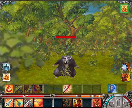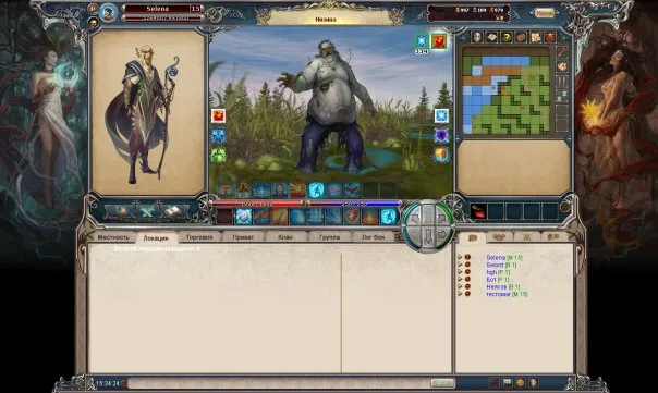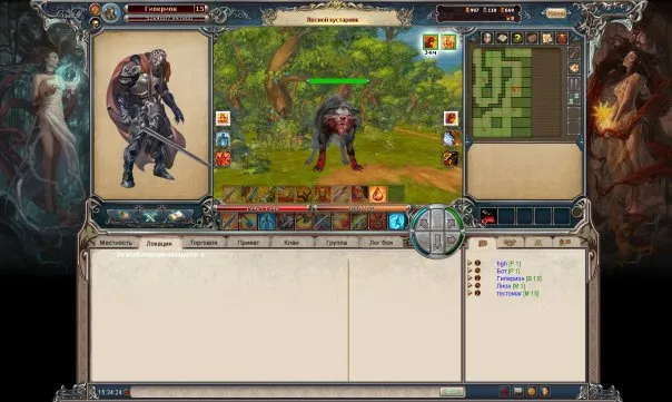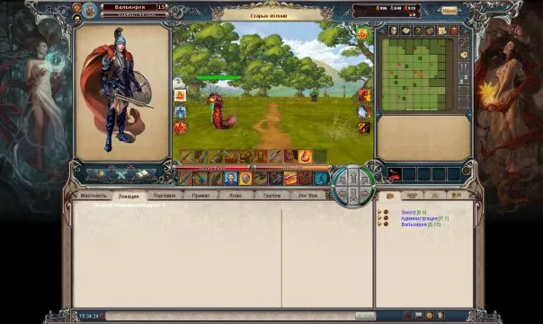 В общем интерфейс игры похож на то как выглядят другие современные российские браузерные игры: нижнюю половину экрана занимает чат; верхняя половина делится на три части: вид персонажа, непосредственно игровую область и миникарту.