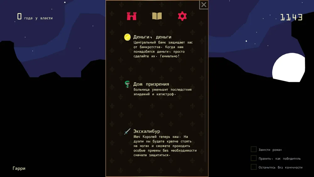 Но, впрочем, не всегда. Некоторые из принятых вами решений, скажем так, долговечны. Например, постройка банка, амбара или госпиталя или нахождение уникального меча. Бывает так, что от некоторых неприятных последствий вы получаете своеобразную "страховку", которая не даст вам потерять свою корону и позволит исправить сложившуюся ситуацию.