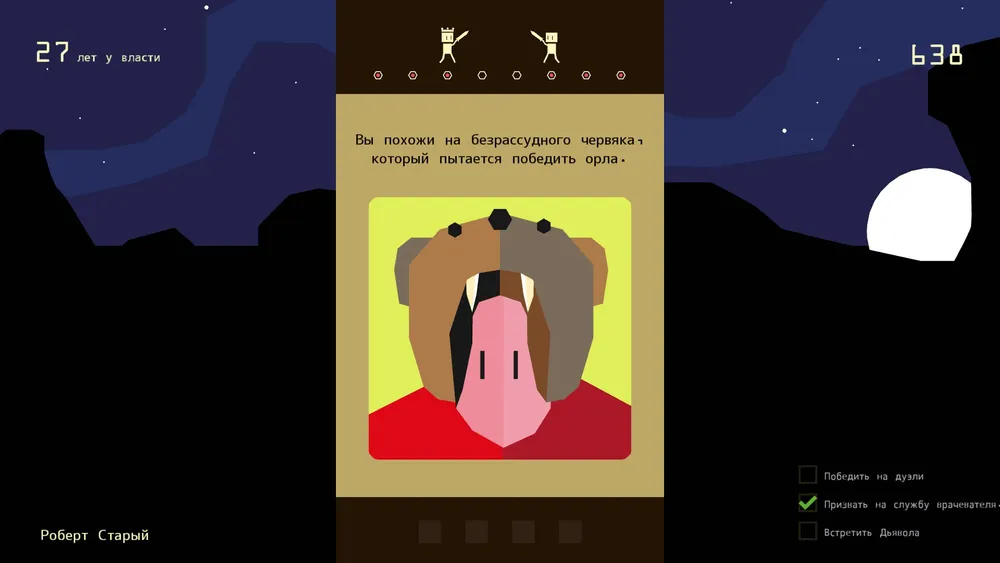 Способов умереть и потерять свой трон тут больше, чем в "Long Live The Queen". Причём, даже не нужно достигать максимума или минимума параметров. Игра сама подкинет вам массу ситуаций, из которых необходимо будет выпутываться.