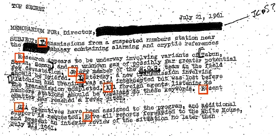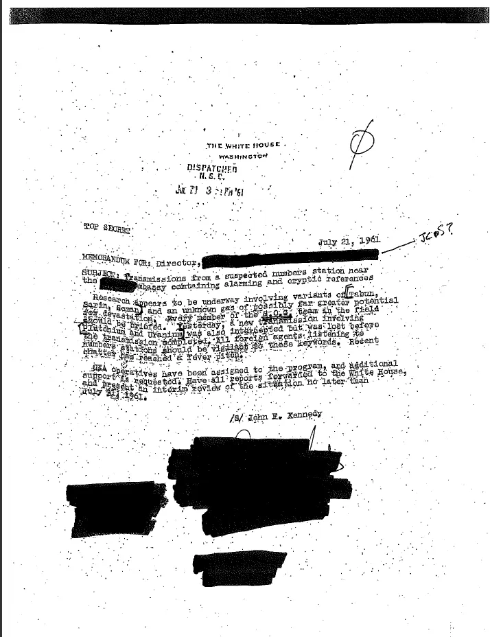 Sarin, Soman]] и неизвестным газом возможно с намного большим разрушительным потенциалом. Каждый член команды S.O.G. должен быть оповещён. Вчера была перехвачена новая передача с шифровкой о [Плутоний и Уран] но связь с передатчиком была потеряна до окончания сообщения. Все иностранное агенты, слушающие цифровую станцию должны быть внимательны к этим ключевым словам. Последние переговоры достигли крайней точки.Дополнительные сотрудники ЦРУ направлены на выполнение этой программы, собраны дополнительные силы. Все имеющиеся отчеты отправлены в Белый дом, предварительный отчет о ситуации будет не позже чем 31 июля 1961.