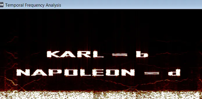 Мужской голос три раза повторяет фразу “Голубой получил задание” (azure has the task). Между этими фразами звучит шум, при частотном анализе этих шумов вырисовывались слова: Napoleon = d , Karl = b (показано на видео)