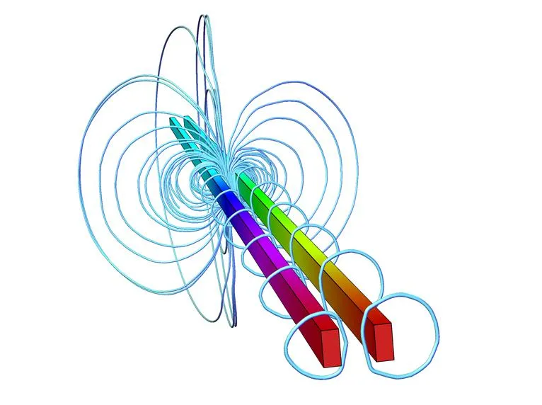 Принцип устройства «рельсотрона» предельно прост. На рельсы подается сильный электрический ток, между ними располагается подвижный проводящий снаряд. Из курса физики многие помнят, что ток неизбежно создает магнитное поле, которое находится вокруг проводника. Направление поля определяется правилом левой руки. Линии магнитного поля направлены против часовой стрелки вокруг плюсового рельса и по часовой стрелке вокруг минусового. В результате между рельсами создается общее однонаправленное вертикальное магнитное поле и на снаряд начинает действовать сила Лоренца. Именно эта сила разгоняет проводящий снаряд.