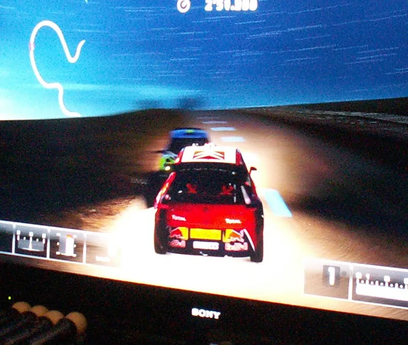 Текущий билд видеоигры демонстрировался на 3D-телевизоре с использованием специальных 3D-очков (всё - марка Sony, разумеется. Включая фоторамку на столике в комнате). К сожалению, фотографий GT5 в 3D-режиме нет, во-первых из-за невозможности передать объём (спасибо, Кэп!), во-вторых, из-за поступившего "сверху" перед началом показа запрета на фото- и видеосъёмку.