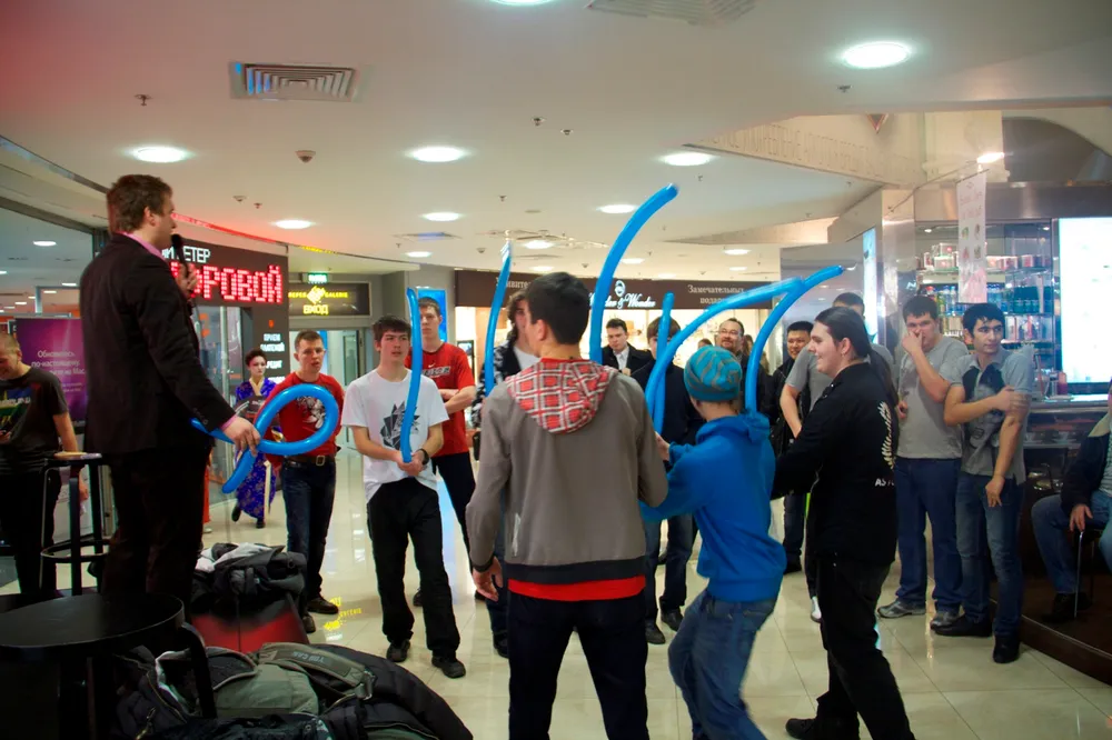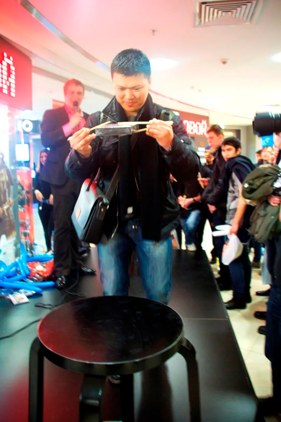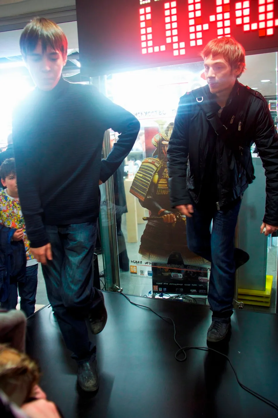 Понятно, что главное оригами постсоветского пространства – самолетик обыкновенный. Желающим раздали листы A4, и тот, чья самодельная авиация пролетит дальше всех, получал в подарок джойстик. Судьей в конкурсе была выбрана Гейша, которая стояла в дальнем конце коридора и решала судьбы участников. Но кто же знал, что участвовать будут снайперы-профессионалы! Самолетики один за другим попадали в несчастную гейшу, куда бы она ни отходила. К счастью, обошлось без жертв, и геймпад получил нового хозяина. Тем временем начало продаж приближалось, таймер отсчитывал последние минуты, и ведущий наконец вспомнил про “преданных фанатов Total War”, стоящих на одной ноге уже пятьдесят минут. Вот эти герои: